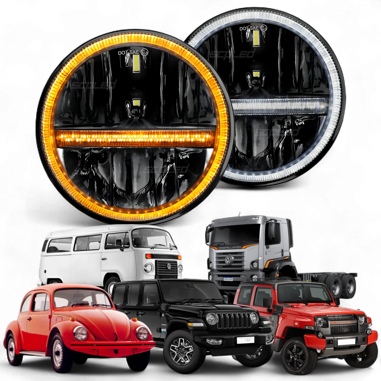 Se você está procurando um farol com design clássico original, mas com visibilidade mais brilhante e funcional, este é o lugar certo. Com um refletor grande, este farol universal de 7 polegadas oferece 5 vezes mais iluminação do que o farol halógeno original, além de possuir luzes em anel (DRL) de duas cores. (Branco/âmbar)